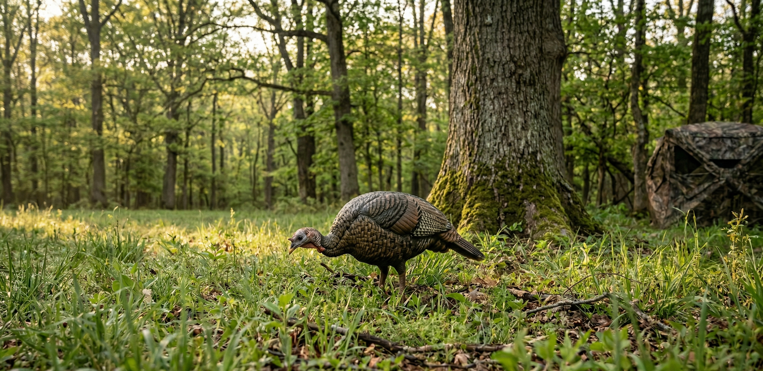 Be in position at least 30 minutes before first light. In mid-April, that means being set up by about 6:15 a.m. In May, you'll want to be in place by 5:45 a.m. Getting in early matters because turkeys can gobble on the roost before you can see your hand in front of your face. If you're still walking in when the first gobble rips, you're late.